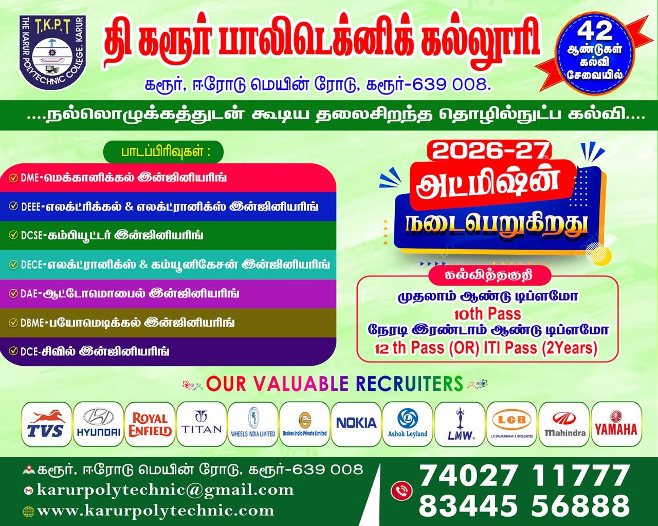 The Karur Polytechnic College is a reputed institution dedicated to technical education and skill development. With well-equipped laboratories, experienced faculty, and a strong focus on industry-relevant training, the college aims to produce competent diploma holders ready to meet modern engineering and technological challenges.